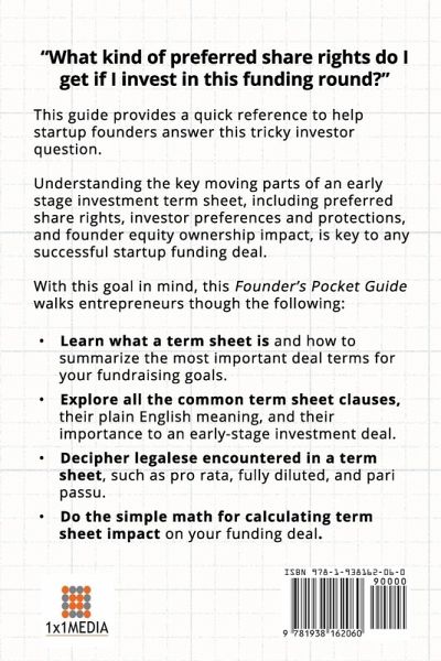 This easy to follow guide helps startup founders understand the key moving parts of an investment term sheet, and review typical preferred share rights, preferences, and protections. Along the way, we also provide easy-to-follow examples for the most common calculations related to preferred share equity deals. Expanding on these fundraising concepts, this Founder's Pocket Guide helps startup founders learn: What a term sheet is and how to summarize the most important deal terms for your fundraising and startup building goals. How preferred stock shares differ from common shares, with review of how each key preferred share right and preference is tied to the investor's shares. Key terms and definitions associated with equity fundraising, such as pre-money valuation, founder dilution, and down round. How to decipher legalese associated with a term sheet deal, such as pro rata, fully diluted, and pari passu. The full list of the most common term sheet clauses, their plain English meaning, and their importance to an early-stage investment deal. Simple math for the key term sheet financial aspects, including calculating fully diluted shares outstanding, investor equity ownership percentages, and the impact of option pools on founder dilution. Example exit scenarios, showing how term sheet deal points impact how exit proceeds get divided among investors and founders.