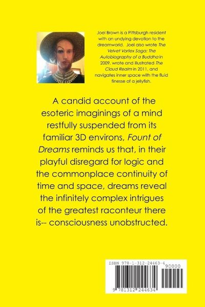A candid account of the esoteric imaginings of a mind restfully suspended from its familiar 3D environs, Fount of Dreams reminds us that, in their playful disregard for logic and the commonplace continuity of time and space, dreams reveal the infinitely complex intrigues of the greatest raconteur there is-- consciousness unobstructed.