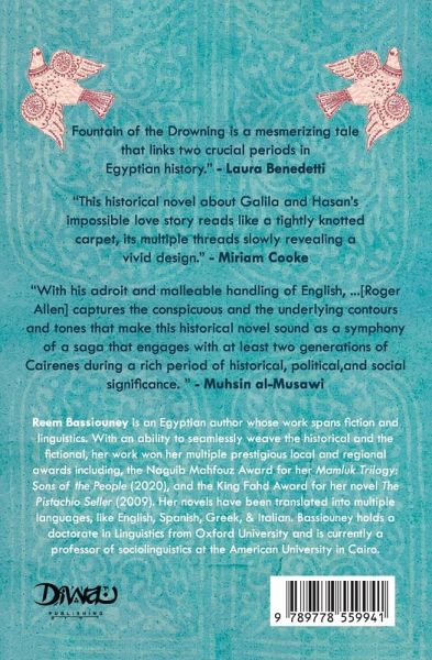 In this historical novel, prize-winning author Reem Bassioney tells a complex love story set against the backdrop of drastic social and political change. History, tradition, and mysticism are intertwined to weave a tale of adoration and loss, domination and suppression, victory and defeat. Fountain of the Drowning is a multi-layered narrative set in the late 19th and early 20th centuries, a period when Egypt witnessed dramatic events, from the construction of the Suez Canal to the British occupation, which brought about rapid modernization and the Europeanization of social norms. Against this tumultuous background, a romance develops between Galila, and Hassan, her black servant and protector, who struggles against prejudice and the limits imposed by his status within society. As it tells the story of the two lovers, the novel paints a vivid panorama of Egyptian society and its transformation: a thriving cotton trade is born, girls' schools are founded, slavery is abolished, ant the city of Cairo is rebuilt on a European model. The novel touches upon a multitude of universal themes, such as acceptance and rejection, forgiveness and revenge, and most importantly the question of agency: Do we have the power to shape the course of our lives?