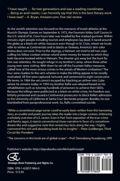As the world's attention was focused on the massacre of Israeli athletes at the Munich Olympic Games on September 6, 1972, the Fountain Valley Golf Course in the U.S. island of St. Croix hours later was invaded by five masked gunmen. Within minutes eight people including tourists and employees lay dead. It raced around the globe as a black-on-white massacre even though in St. Croix, where we locals refer to whites as Continentals and to blacks as Yankees, America's skin color drama does not exist. Prior to the slayings, a Vietnam vet tried to kill two cops cuffing his fellow combat veteran who'd stolen money for heroin to which they both became hooked while in Vietnam. The shooter got away but the hunt for him was relentless. He sought refuge in my brother's camp, where three other young men were visiting. With them he set off the Fountain Valley massacre, called "one of the most vicious crimes in the annals of Western civilization." The four were clueless to the vet's scheme to make the killing appear to be racially motivated. All five were captured, tortured, and sentenced to eight consecutive life terms. In 1984 the vet convict escaped by hijacking an airliner into Cuba where he remains today. In 1994 my brother Rafie was released based on his rehabilitation such as tutoring hundreds of prisoners to achieve their GEDs. Because the killings were publicized as a black-on-white crime, his freedom was bitterly protested and caused a Continental prosecutor to block Rafie's admission to the University of California at Santa Cruz' doctorate program. Besides, he was blackballed from paraprofessional work. So, Rafie committed suicide."While a conventional page turner could've easily been written from this harrowing story, an erudite and poetic journey takes the reader into a larger context, embracing a scholarly overview of U.S. racism. Even in Part Two's exposition of the true-crime and family sagas, it rejects conventional linear narrative in favor of a sometimes dream-like and suggestive style that reveals key facts along the way. I highly commend this rich and absorbing book for its insights." - Peter Goldberger, Third Circuit Bar President"The concerns in this book are of global scope." - Prof. Dannabang Kuwabong, UPR