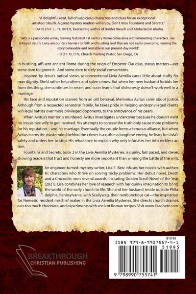 In bustling, affluent ancient Rome during the reign of Emperor Claudius, status matters-yet some dare to ignore it. And some dare to defy social conventions. Inspired by Jesus's radical views, unconventional Livia Aemilia cares little about stuffy Roman dignity. She'd rather help others and solve crimes. But when her new husband forbids her from sleuthing, she continues in secret and soon learns that dishonesty doesn't work well in a marriage. His face and reputation scarred from an old betrayal, Memmius Avitus cares about justice. Although from a respected senatorial family, he takes pride in helping underprivileged clients win legal battles over more privileged opponents, to the annoyance of his peers. When Avitus's mentor is murdered, Avitus investigates undercover because he doesn't want his inquisitive wife to get involved. His attempts to conceal the truth only cause more problems for his reputation-and his marriage. Eventually the couple forms a tenuous alliance, but when Avitus learns the mastermind behind the crimes is a ruthless longtime enemy, he fears for Livia's safety and orders her to stop. His reluctance to explain why only infuriates her into reckless action. Fountains and Secrets, book 2 in the Livia Aemilia Mysteries, is quirky, fast paced, and clever, showing readers that trust and honesty are more important than winning the battle of the wills.