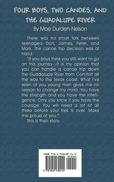 From the town of Comfort in the Central Hill Country of Texas to the Gulf Coast of Texas, in 1971, four boys, ages 17 and 15, set out in two canoes to travel via the Guadalupe River 500 miles to the Gulf. Parents had given their consent and met them every Sunday. Two boys, kept daily journals and one took 80 pictures. Their adventure took them over huge Canyon Lake -- showing whitecaps -- an encounter with an attacking granddaddy cottonmouth moccasin -- a six-inch rainfall -- and logjams. The book concludes with brief biographies of the three remaining adventurers, (now successful businessmen) and one is a scientist at Texas A&M and also includes perspectives of how they view their daring odyssey from today's vantage point. It is dedicated to all teenage boys who not only dream dreams of adventure, but are lucky enough to follow them and live to tell the story.