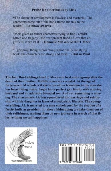 The four Burd siblings head to Mexico to heal and regroup after the death of their mother. Midlife crises are revealed. At the age of forty-seven, M wonders if she is too old to transition to the man she has been hiding inside her. Augie has a perfect gay family with a loving husband and an adorable bi-racial son. And yet, something is missing. The charismatic Lio has squandered his marriage and relationship with his daughter in favor of a hedonistic lifestyle. The youngest sibling, AJ, is married to a man emboldened by the election of a fascist bully as president. It takes a kidnapping to shake them out of their self-absorption, sending them on a new journey.