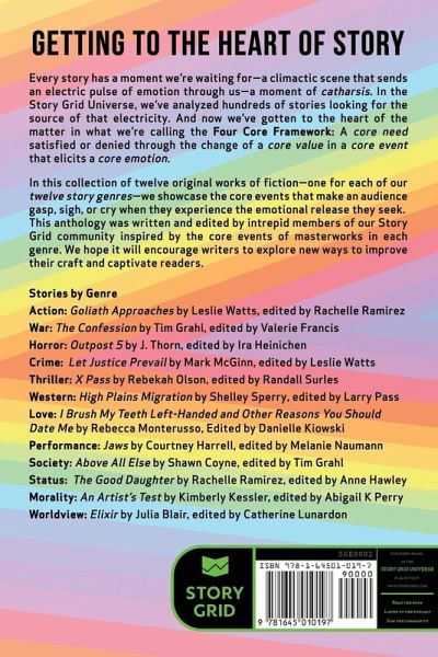 Getting to the Heart of Story Every story has a moment we're waiting for-a climactic scene that sends an electric pulse of emotion through us-a moment of catharsis. In the Story Grid Universe, we've analyzed hundreds of stories looking for the source of that electricity. And now we've gotten to the heart of the matter in what we're calling the Four Core Framework: A core need satisfied or denied through the change of a core value in a core event that elicits a core emotion. In this collection of twelve original works of fiction-one for each of our twelve story genres-we showcase the core events that make an audience gasp, sigh, or cry when they experience the emotional release they seek. This anthology was written and edited by intrepid members of our Story Grid community inspired by the core events of masterworks in each genre. We hope it will encourage writers to explore new ways to improve their craft and captivate readers. Stories by Genre Action: Goliath Approaches by Leslie Watts, edited by Rachelle Ramirez War: The Confession by Tim Grahl, edited by Valerie Francis Horror: Outpost 5 by J. Thorn, edited by Ira Heinichen Crime: Let Justice Prevail by Mark McGinn, edited by Leslie Watts Thriller: X Pass by Rebekah Olson, edited by Randall Surles Western: High Plains Migration by Shelley Sperry, edited by Larry Pass Love: I Brush My Teeth Left-Handed and Other Reasons You Should Date Me by Rebecca Monterusso, Edited by Danielle Kiowski Performance: Jaws by Courtney Harrell, edited by Melanie Naumann Society: Above All Else by Shawn Coyne, edited by Tim Grahl Status: The Good Daughter by Rachelle Ramirez, edited by Anne Hawley Morality: An Artist's Test by Kimberly Kessler, edited by Abigail K Perry Worldview: Elixir by Julia Blair, edited by Catherine Lunardon