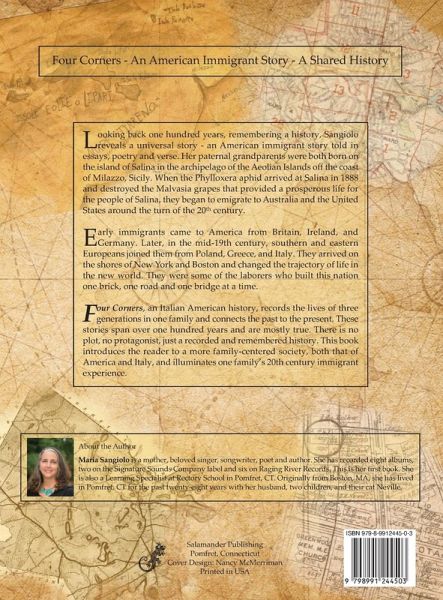 Four Corners, an Italian American history, records the lives of three generations in one family and connects the past to the present. These stories span over one hundred years and are mostly true. There is no plot, no protagonist, just a recorded and remembered history. This book introduces the reader to a more family-centered society, both that of America and Italy, and illuminates one family's 20th century immigrant experience. Looking back one hundred years, remembering a history, Sangiolo reveals a universal story - an American immigrant story told in essays, poetry and verse. Her paternal grandparents were both born on the island of Salina in the archipelago of the Aeolian Islands off the coast of Milazzo, Sicily. When the Phylloxera aphid arrived at Salina in 1888 and destroyed the Malvasia grapes that provided a prosperous life for the people of Salina, they began to emigrate to Australia and the United States around the turn of the 20th century.