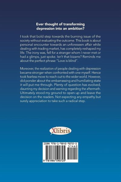 Ever thought of transforming depression into an ambition? I took that bold step towards the burning issue of the society without evaluating the outcome. This book is about personal encounter towards an unforeseen affair while dealing with trading market, has completely reshaped my life. The irony was, fell for a stranger whom I never met or had a glimps, just spoke. Isn't that bizarre? Reminds me about the perfect phrase "Love is blind". Moreover, the realization of people dealing with depression became stronger when confronted with one myself. Hence took fearless move to reach out to the wider world. However, did ponder about the embarrassing and humiliating state it will put me through. Plenty of question has evolved, daunting my decision and warning regarding the aftermath. Ultimately stood my ground to open up and leave the decision on the readers. Not expecting any empathy but surely appreciation to take such a radical step.