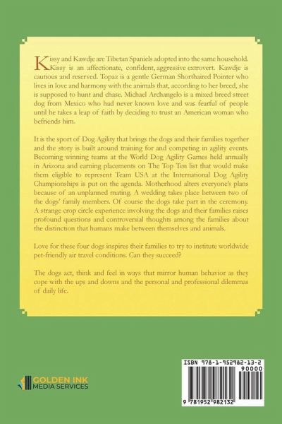 Kisyy and Kawdje are Tibetan Spaniels adopted into the same household. Kissy is an affectionate, confident, aggressive extrovert. Kawdje is cautious and reserved. Topaz is a gentle German Shorthaired Pointer who lives in love and harmony with the animals that, according to her breed, she is supposed to hunt and chase. Michael Archangelo is a mixed breed street dog from Mexico who had never known love and was fearful of people until he takes a leap of faith by deciding to trust an American woman who befriends him. It is the sport of Dog Agility that brings the dogs and their families together and the story is built around training for and competing in agility events. Becoming winning teams at the World Dog Agility Games held annually in Arizona and earning placements on The Top Ten list that would make them eligible to represent Team USA at the International Dog Agility Championships is put on the agenda. Motherhood alters everyone's plans because of an unplanned mating. A wedding takes place between two of the dogs' family members. Of course the dogs take part in the ceremony. A strange crop circle experience involving the dogs and their families raises profound questions and controversial thoughts among the families about the distinction that humans make between themselves and animals. Love for these four dogs inspires their families to try to institute worldwide pet-friendly air travel conditions. Can they succeed? ¿The dogs act, think and feel in ways that mirror human behavior as they cope with the ups and downs and the personal and professional dilemmas of daily life.