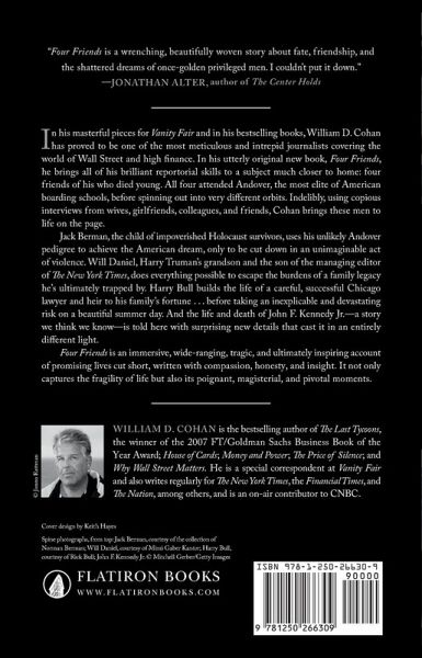 A powerful portrait of the lives of four boarding school graduates who died too young, John F. Kennedy, Jr. among them, by their fellow Andover classmate, New York Times bestselling author William D. Cohan. In his masterful pieces for Vanity Fair and in his bestselling books, William D. Cohan has proven to be one of the most meticulous and intrepid journalists covering the world of Wall Street and high finance. In his utterly original new book, Four Friends, he brings all of his brilliant reportorial skills to a subject much closer to home: four friends of his who died young. All four attended Andover, the most elite of American boarding schools, before spinning out into very different orbits. Indelibly, using copious interviews from wives, girlfriends, colleagues, and friends, Cohan brings these men to life on the page. Jack Berman, the child of impoverished Holocaust survivors, uses his unlikely Andover pedigree to achieve the American dream, only to be cut down in an unimaginable act of violence. Will Daniel, Harry Truman's grandson and the son of the managing editor of The New York Times, does everything possible to escape the burdens of a family legacy he's ultimately trapped by. Harry Bull builds the life of a careful, successful Chicago lawyer and heir to his family's fortune...before taking an inexplicable and devastating risk on a beautiful summer day. And the life and death of John F. Kennedy, Jr.-a story we think we know-is told here with surprising new details that cast it in an entirely different light. Four Friends is an immersive, wide-ranging, tragic, and ultimately inspiring account of promising lives cut short, written with compassion, honesty, and insight. It not only captures the fragility of life but also its poignant, magisterial, and pivotal moments.
