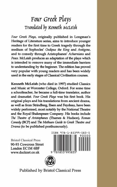 These translations of "Oedipus the King", "Antigone", "Acharnians" and "Peace", are here reissued in paperback. They are written to be accessible for use in schools and for performance, and contain no Greek text.