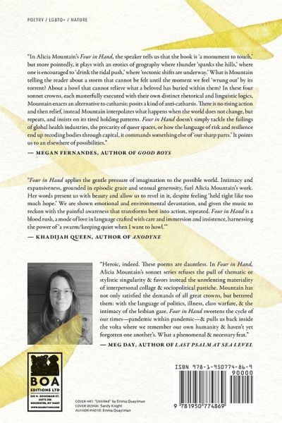 "Comprised of four heroic crowns of sonnets, Alicia Mountain's Four in Hand is both formal and experimental, ranging from lyric romantic and familial narratives to blank verses of reconfigured found text pulled from financial newsletter emails. Language and white space equally captivate with their sparsity and abundance as Mountain pursues the implications of national political identity with intersectional awareness. These poems interrogate our collective complicity in late-stage capitalism, drone warfare, the election of Donald Trump, environmental degradation, mental health crises, and the dawn of Covid-19 through the lens of gay poetic lineage, regionalism, and familial kinships structures"--