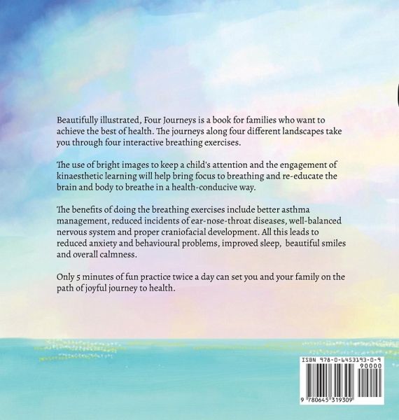 Beautifully illustrated, Four Journeys is a book for families who want to achieve the best of health. The journeys along four different landscapes take you through four interactive breathing exercises. The use of bright images to keep a child's attention, and the engagement of kinaesthetic learning will help bring focus to breathing and re-educate the brain and body to breathe in a health-conducive way. The benefits of doing the breathing exercises include better asthma management, reduced incidents of ear-nose-throat diseases, well-balanced nervous system and proper craniofacial development. All of this leads to reduced anxiety and behavioural problems, improved sleep, beautiful smiles and overall calmness. Only 5 minutes of fun practice twice a day can set you and your family on the path of a joyful journey to health.