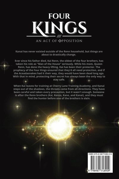 Highlights Immersive Fantasy Supernatural Abilities Multiple POV Family Dynamics Violence Mystery Corruption Book Blurb Kanai has never existed outside of the Renn household, but things are about to drastically change. Ever since his father died, Kai Renn, the oldest of the four brothers, has taken his role as "Man of the House" seriously. While his mom, Queen Renn, has done the heavy lifting, Kai has been their protector. The prophecy of the Four Kings ensured that they'd all need protection, and if the Aceadasnakes had it their way, they would have been dead long ago. With that in mind, protecting their secret has always been the only way to stay safe. When Kai leaves for training at Cherry Lane Training Academy, and Kanai steps out of the shadows, the threats come from all directions. They have been careful and taken every precaution, but it wasn't enough. Someone is after the Renn brothers (Kai, Kenzo, Kane, and Kanai), and they must find the hunter before one of the brothers is slain. Author Bio Erica is a writer, dedicated mother, and proud North Carolina A&T State University graduate. Four Kings: An Act of Opposition is her first novel in the Four Kings series, inspired by short stories created for her sons. When she is not writing, she enjoys quality time with her family. Formats available ebook paperback hardcover Details Suggested reading age 10 years and up Print length 319 pages Language English Grade level 5 - 10 Word Count 83,810 Publication date May 23, 2023 ISBN-soft cover 979-8-9877489-0-9 ISBN-ebook 979-8-9877489-1-6 ISBN-hardcover: 979-8-9877489-2-3
