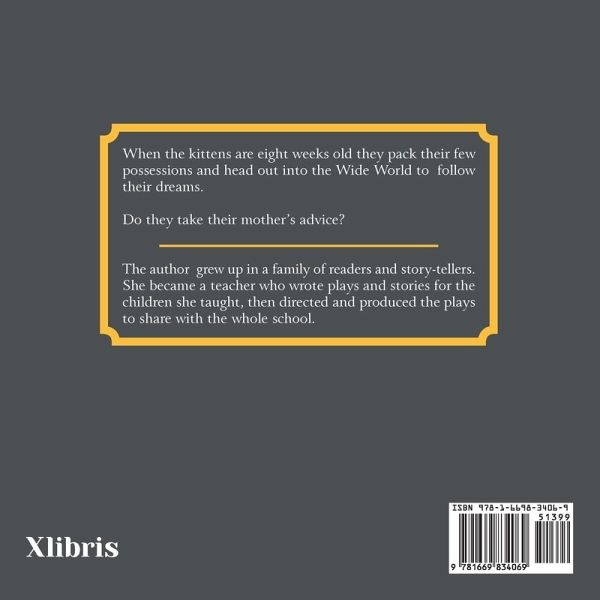 When the kittens are eight weeks old they pack their few possessions and head out into the Wide World to follow their dreams. Do they take their mother's advice?