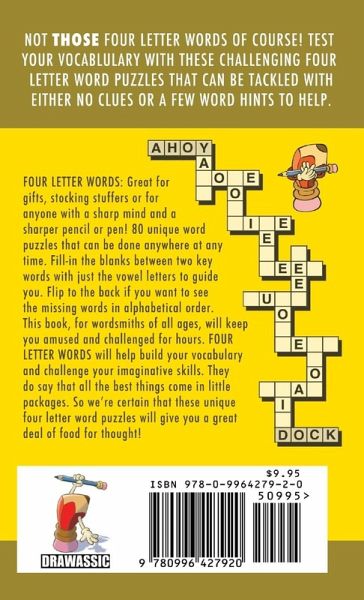 FOUR LETTER WORDS: Great for gifts, stocking stuffers or for anyone with a sharp mind and a sharper pencil! 80 unique word puzzles that you can do anywhere, at any time. Fill in the blanks between two key words and linking words with just the vowel letters shown. Flip to the back if you want to see the words in alphabetical order. More than just a book of puzzles. It will keep you amused for hours and help you build your vocabulary through imaginative skills. Increase your knowledge also by looking up the words you don't know. Quite often in life the best things invariably come in small packages - four letters long in this case! An ideal purchase for anyone who is interested in crosswords, Scrabble or any word challenges that expand the mind.