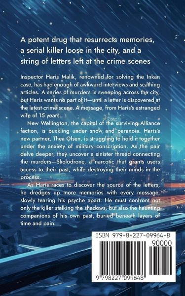 A potent drug that resurrects memories, a serial killer loose in the city, and a string of letters left at the crime scenes. Inspector Haris Malik, renowned for solving the Inkan case, has had enough of awkward interviews and scathing articles. A series of murders is sweeping across the city, but Haris wants no part of it-until a letter is discovered at the latest crime scene. A message, from Haris's estranged wife of 15 years. New Wellington, the capital of the surviving Alliance faction, is buckling under snow and paranoia. Haris's new partner, Thea Olsen, is struggling to hold it together under the anxiety of military conscription. As the pair delve deeper, they uncover a sinister thread connecting the murders-Skolodrone, a narcotic that grants users access to their past, while destroying their minds in the process. As Haris races to discover the source of the letters, he dredges up more memories with every message, slowly tearing his psyche apart. He must confront not only the killer stalking the shadows, but also the haunting companions of his own past, buried beneath layers of time and pain. "Isn't it just so great when you find one of those books that completely drags you in, makes you fall in love with the characters, and demands that you sit on the edge of your seat for every horrific, nail-biting moment of it? Well this is definitely one of them! This is an incredibly well written book. The story telling is riveting." Jess McCallops "The book really gets into all the characters' lives. I look forward to reading more." Sabrinasbooks
