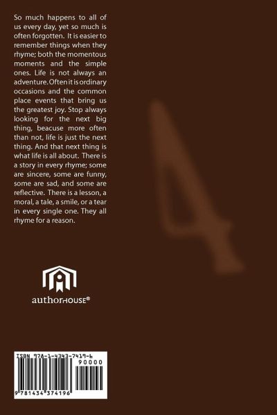 So much happens to all of us every day, yet so much is often forgotten. It is easier to remember things when they rhyme; both the momentous moments and the simple ones. Life is not always an adventure. Often it is ordinary occasions and the common place events that bring us the greatest joy. Stop always looking for the next big thing, beacuse more often than not, life is just the next thing. And that next thing is what life is all about. Every rhyme contains a story; some are sincere, some are funny, some are sad, and some are reflective. There is a lesson, a moral, a tale, a smile, or a tear in every single one. They all rhyme for a reason.