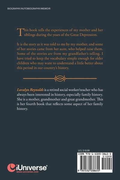 This book tells the experiences of my mother and her siblings during the years of the Great Depression. It is the story as it was told to me by my mother, and some of her stories came from her aunt, who helped raise them. Some of the stories are from my grandfather?s telling. I have tried to keep the vocabulary simple enough for older children who may want to understand a little better about this period in our country?s history.