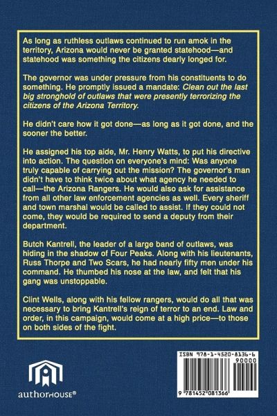 As long as ruthless outlaws continued to run amok in the territory, Arizona would never be granted statehood-and statehood was something the citizens dearly longed for. The governor was under pressure from his constituents to do something. He promptly issued a mandate: Clean out the last big stronghold of outlaws that were presently terrorizing the citizens of the Arizona Territory. He didn't care how it got done-as long as it got done, and the sooner the better. He assigned his top aide, Mr. Henry Watts, to put his directive into action. The question on everyone's mind: Was anyone truly capable of carrying out the mission? The governor's man didn't have to think twice about what agency he needed to call-the Arizona Rangers. He would also ask for assistance from all other law enforcement agencies as well. Every sheriff and town marshal would be called to assist. If they could not come, they would be required to send a deputy from their department. Butch Kantrell, the leader of a large band of outlaws, was hiding in the shadow of Four Peaks. Along with his lieutenants, Russ Thorpe and Two Scars, he had nearly fifty men under his command. He thumbed his nose at the law, and felt that his gang was unstoppable. Clint Wells, along with his fellow rangers, would do all that was necessary to bring Kantrell's reign of terror to an end. Law and order, in this campaign, would come at a high price-to those on both sides of the fight.