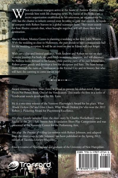 When mysterious strangers arrive at the home of Andrew Correo, they provide him with life changing news. He learns of the Vedicatori, a secret organization established by his ancestors, an organization he now has the chance to inherit control over. In order to gain this control, he needs to compete with Robert Stavero in a global scavenger hunt. They must search for four illusive crystals that, when brought together, will tell them their final destination. Also in Edson, Monica Correo is planning a wedding to her love, John Weaver. With the wedding so close to Halloween, the pair decide to have a masquerade ball for the wedding reception. It will be an event no one in Edson will ever forget. With just a clue and limited guidance, both Andrew and Robert set out on their secretive journey. For both, the path leads to mystery, suspense, and self-discovery. As Andrew looks forward to his future, while putting parts of his past behind him, Robert grows greedy and develops a love for deception and hate. The hunt brings them through the ruins of Teotihuacan to the Eternal City and its history, but who will have the cunning to come out on top?