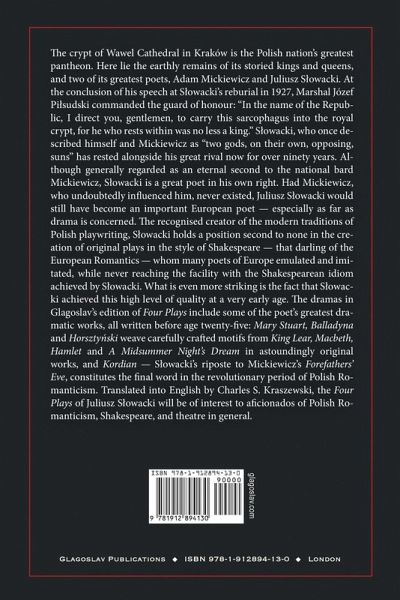 The crypt of Wawel Cathedral in Kraków is the Polish nation's greatest pantheon. Here lie the earthly remains of its storied kings and queens, and two of its greatest poets, Adam Mickiewicz and Juliusz S¿owacki. At the conclusion of his speech at S¿owacki's reburial in 1927, Marshal Józef Pi¿sudski commanded the guard of honour: "In the name of the Republic, I direct you, gentlemen, to carry this sarcophagus into the royal crypt, for he who rests within was no less a king." S¿owacki, who once described himself and Mickiewicz as "two gods, on their own, opposing, suns" has rested alongside his great rival now for over ninety years. Although generally regarded as an eternal second to the national bard Mickiewicz, S¿owacki is a great poet in his own right. Had Mickiewicz, who undoubtedly influenced him, never existed, Juliusz S¿owacki would still have become an important European poet - especially as far as drama is concerned. The recognised creator of the modern traditions of Polish playwriting, S¿owacki holds a position second to none in the creation of original plays in the style of Shakespeare - that darling of the European Romantics - whom many poets of Europe emulated and imitated, while never reaching the facility with the Shakespearean idiom achieved by S¿owacki. What is even more striking is the fact that S¿owacki achieved this high level of quality at a very early age. The dramas in Glagoslav's edition of Four Plays include some of the poet's greatest dramatic works, all written before age twenty-five: Mary Stuart, Balladyna and Horszty¿ski weave carefully crafted motifs from King Lear, Macbeth, Hamlet and A Midsummer Night's Dream in astoundingly original works, and Kordian - S¿owacki's riposte to Mickiewicz's Forefathers' Eve, constitutes the final word in the revolutionary period of Polish Romanticism. Translated into English by Charles S. Kraszewski, the Four Plays of Juliusz S¿owacki will be of interest to aficionados of Polish Romanticism, Shakespeare, and theatre in general.