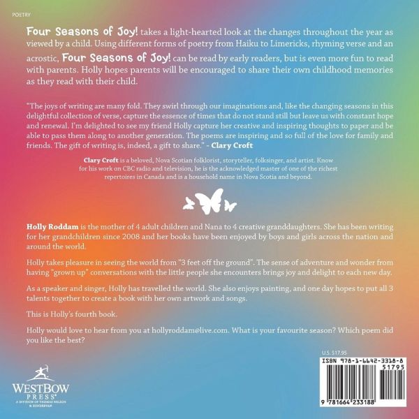 Four Seasons of Joy! takes a light-hearted look at the changes throughout the year as viewed by a child. Using different forms of poetry from Haiku to Limericks, rhyming verse and an acrostic, Four Seasons of Joy! can be read by early readers, but is even more fun to read with parents. Holly hopes parents will be encouraged to share their own childhood memories as they read with their child. "The joys of writing are many fold. They swirl through our imaginations and, like the changing seasons in this delightful collection of verse, capture the essence of times that do not stand still but leave us with constant hope and renewal. I'm delighted to see my friend Holly capture her creative and inspiring thoughts to paper and be able to pass them along to another generation. The poems are inspiring and so full of the love for family and friends. The gift of writing is, indeed, a gift to share." - Clary Croft Clary Croft is a beloved, Nova Scotian folklorist, storyteller, folksinger, and artist. Know for his work on CBC radio and television, he is the acknowledged master of one of the richest repertoires in Canada and is a household name in Nova Scotia and beyond.
