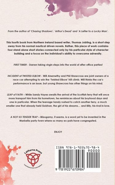 From the author of 'Chasing Shadows', 'Arthur's Dead' and 'A Letter to a Lucky Man'. This fourth book from Northern Ireland based writer, Thomas Jobling, is a short step away from his normal nautical driven novels. Rather, this piece of work contains four stand alone short stories connected only by his particular style of character building and a focus on the individual's ability to overcome adversity. FIRST TIMER - Darren taking virgin steps into the world of after-office parties! INCIDENT at TWISTED ELBOW - Will Abernethy and Phil Shawcross are joint owners of a race car attempting to win the 'Twisted Elbow' hill climb. Will thinks the car's performance is an issue, but young Shawcross has other things on his mind. LEAP of FAITH - While Sandy Hayes awaits the arrival of the Scottish ferry that will once more transport him from his hometown, he reminisces about his boyhood days and one in particular. When the teenage Sandy rushed to catch another ferry, a much smaller one that already held Siobhan, the girl of his dreams... and Billy, his rival in love. A NOT SO TENDER TRAP - Misogyny, it seems, is a word yet to be invented in the Marbella party-town where so many ex-pats have congregated. ENJOY