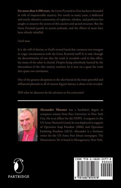 For more than 4,500 years, the Great Pyramid at Giza has been shrouded in veils of impenetrable mystery. For nearly as many years, a dedicated and nearly obsessive community of explorers, scholars, and profiteers has sought to uncover the secrets of this ancient and sacred structure. But the Great Pyramid guards its secrets jealously, and the efforts of most have been silently rebuffed. Until now. Is it the will of destiny or God's eternal hand that connects two strangers in tragic circumstances with the Great Pyramid itself? It is only through the determination of one that the truth is revealed-and in that effort, the name of the other is cleared. Despite being relentlessly hunted by the descendants of the elite ancient warriors, he is now on a quest for truth that spans two continents. One of the greatest deceptions in the after-burial of the most powerful and influential pharaoh in all of ancient Egypt's history is about to be revealed. Will what he discovers be his salvation or his extinction?