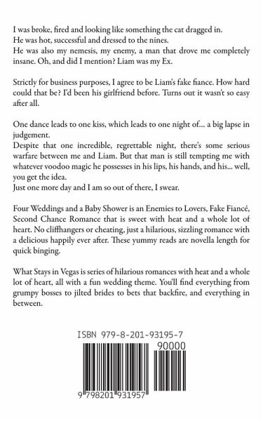 I was broke, fired and looking like something the cat dragged in. He was hot, successful and dressed to the nines. He was also my nemesis, my enemy, a man that drove me completely insane. Oh, and did I mention? Liam was my Ex. Strictly for business purposes, I agree to be Liam's fake fiance. How hard could that be? I'd been his girlfriend before. Turns out it wasn't so easy after all. One dance leads to one kiss, which leads to one night of… a big lapse in judgement. Despite that one incredible, regrettable night, there's some serious warfare between me and Liam. But that man is still tempting me with whatever voodoo magic he possesses in his lips, his hands, and his... well, you get the idea. Just one more day and I am so out of there, I swear. Four Weddings and a Baby Shower is an Enemies to Lovers, Fake Fiancé, Second Chance Romance that is sweet with heat and a whole lot of heart. No cliffhangers or cheating, just a hilarious, sizzling romance with a delicious happily ever after. These yummy reads are novella length for quick binging. What Stays in Vegas is series of hilarious romances with heat and a whole lot of heart, all with a fun wedding theme. You'll find everything from grumpy bosses to jilted brides to bets that backfire, and everything in between.