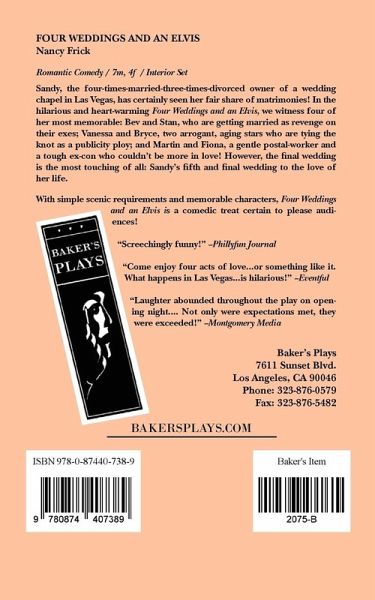 Romantic ComedyCharacters: 7 male, 4 femaleInterior SetSandy, the four-times-married-three-times-divorced owner of a wedding chapel in Las Vegas, has certainly seen her fair share of matrimonies! In the hilarious and heart-warming Four Weddings and an Elvis, we witness four of her most memorable: Bev and Stan, who are getting married as revenge on their exes; Vanessa and Bryce, two arrogant aging stars who are tying the knot as a publicity ploy; and Martin and Fiona, a gentl