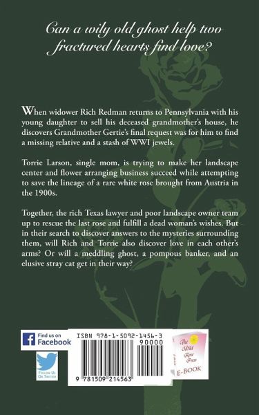 When widower Rich Redman returns to Pennsylvania with his young daughter to sell his deceased grandmother’s house, he discovers Grandmother Gertie’s final request was for him to find a missing relative and a stash of WWI jewels. Torrie Larson, single mom, is trying to make her landscape center and flower arranging business succeed while attempting to save the lineage of a rare white rose brought from Austria in the 1900s. Together, the rich Texas lawyer and poor landscape owner team up to rescue the last rose and fulfill a dead woman’s wishes. But in their search to discover answers to the mysteries surrounding them, will Rich and Torrie also discover love in each other’s arms? Or will a meddling ghost, a pompous banker, and an elusive stray cat get in their way?