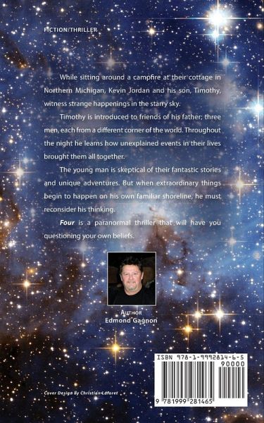 While sitting around a campfire at their cottage in Northern Michigan, Kevin Jordan and his son, Timothy, witness strange happenings in the starry sky. Timothy is introduced to friends of his father; three men, each from a different corner of the world. Throughout the night he learns how unexplained events in their lives brought them all together. The young man is skeptical of their fantastic stories and unique adventures. But when extraordinary things begin to happen on his own familiar shoreline, he must reconsider his thinking. Four is a paranormal thriller that will have you questioning your own beliefs.