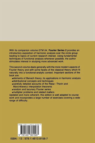 11 Spans of Translates. Closed Ideals. Closed Subalgebras. Banach Algebras.- 11.1 Closed Invariant Subspaces and Closed Ideals.- 11.2 The Structure of Closed Ideals and Related Topics.- 11.3 Closed Subalgebras.- 11.4 Banach Algebras and Their Applications.- Exercises.- 12 Distributions and Measures.- 12.1 Concerning C?.- 12.2 Definition and Examples of Distributions and Measures.- 12.3 Convergence of Distributions.- 12.4 Differentiation of Distributions.- 12.5 Fourier Coefficients and Fourier Series of Distributions.- 12.6 Convolutions of Distributions.- 12.7 More about M and Lp.- 12.8 Hilbert's Distribution and Conjugate Series.- 12.9 The Theorem of Marcel Riesz.- 12.10 Mean Convergence of Fourier Series in LP (1 < p < ?).- 12.11 Pseudomeasures and Their Applications.- 12.12 Capacities and Beurling's Problem.- 12.13 The Dual Form of Bochner's Theorem.- Exercises.- 13 Interpolation Theorems.- 13.1 Measure Spaces.- 13.2 Operators of Type (p, q).- 13.3 The Three Lines Theorem.- 13.4 The Riesz-Thorin Theorem.- 13.5 The Theorem of Hausdorff-Young.- 13.6 An Inequality of W. H. Young.- 13.7 Operators of Weak Type.- 13.8 The Marcinkiewicz Interpolation Theorem.- 13.9 Application to Conjugate Functions.- 13.10 Concerning ?*f and s*f.- 13.11 Theorems of Hardy and Littlewood, Marcinkiewicz and Zygmund.- Exercises.- 14 Changing Signs of Fourier Coefficients.- 14.1 Harmonic Analysis on the Cantor Group.- 14.2 Rademacher Series Convergent in L2(?).- 14.3 Applications to Fourier Series.- 14.4 Comments on the Hausdorff-Young Theorem and Its Dual.- 14.5 A Look at Some Dual Results and Generalizations.- Exercises.- 15 Lacunary Fourier Series.- 15.1 Introduction of Sidon Sets.- 15.2 Construction and Examples of Sidon Sets.- 15.3 Further Inequalities Involving Sidon Sets.-15.4 Counterexamples concerning the Parseval Formula and Hausdorff-Young Inequalities.- 15.5 Sets of Type (p, q) and of Type ?(p).- 15.6 Pointwise Convergence and Related Matters.- 15.7 Dual Aspects: Helson Sets.- 15. 8 Other Species of Lacunarity.- Exercises.- 16 Multipliers.- 16.1 Preliminaries.- 16.2 Operators Commuting with Translations and Convolutions; m-operators.- 16.3 Representation Theorems for m-operators.- 16.4 Multipliers of Type (LP, Lq).- 16.15 A Theorem of Kaczmarz-Stein.- 16.6 Banach Algebras Applied to Multipliers.- 16.7 Further Developments.- 16.8 Direct Sum Decompositions and Idempotent Multipliers.- 16.9 Absolute Multipliers.- 16.10 Multipliers of Weak Type (p, p).- Exercises.- Research Publications.- Corrigenda to 2nd (Revised) Edition of Volume 1.- Symbols.