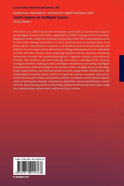 This book is a collection of selected papers presented at the Fourth Congress on Intelligent Systems (CIS 2023), organized by CHRIST (Deemed to be University), Bangalore, India, under the technical sponsorship of the Soft Computing Research Society, India, during September 4-5, 2023. It includes novel and innovative work from experts, practitioners, scientists, and decision-makers from academia and industry. It covers topics such as the Internet of Things, information security, embedded systems, real-time systems, cloud computing, big data analysis, quantum computing, automation systems, bio-inspired intelligence, cognitive systems, cyber-physical systems, data analytics, data/web mining, data science, intelligence for security, intelligent decision-making systems, intelligent information processing, intelligent transportation, artificial intelligence for machine vision, imaging sensors technology, image segmentation, convolutional neural network, image/video classification,soft computing for machine vision, pattern recognition, human-computer interaction, robotic devices and systems, autonomous vehicles, intelligent control systems, human motor control, game playing, evolutionary algorithms, swarm optimization, neural network, deep learning, supervised learning, unsupervised learning, fuzzy logic, rough sets, computational optimization, and neuro-fuzzy systems.