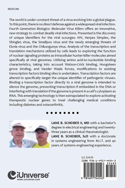 The world is under constant threat of a virus evolving into a global plague.To this point, there is no direct defense against a widespread viral infection. Fourth Generation Biologics: Molecular Virus Killers offers an innovative, new strategy to combat deadly viral infections. Presented is the discovery of unique identifiers for the viral scourges: HIV, Herpes Simplex, the Shingles virus, the Smallpox virus and the newly emerging threats of Ebola virus and the Chikungunya virus. Analysis of the transcription and translation mechanisms utilized by cells leads to exploring the function of nuclear signaling proteins as intracellular hunter-killer molecules aimed specifically at viral genomes. Utilizing amino acid-to-nucleotide binding characteristics, taking into account Watson-Crick binding, Hoogsteen grove binding, and Vander Waals forces, modifications to existing transcription factors binding sites is undertaken. Transcription factors are altered to specifically target the unique identifier of pathogenic viruses. Binding a transcription factor directly to a viral genome is intended to silence the genome, preventing transcription if embedded in the DNA or interfering with translation if the genome is present in a cell's cytoplasm as RNA. This emerging technology is then extrapolated to explore activating therapeutic nuclear genes to treat challenging medical conditions including diabetes and osteoarthritis.