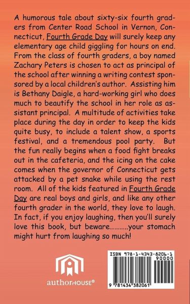 A humorous tale about sixty-six fourth graders from Center Road School in Vernon, Connecticut, Fourth Grade Day will surely keep any elementary age child giggling for hours on end. From the class of fourth graders, a boy named Zachary Peters is chosen to act as principal of the school after winning a writing contest sponsored by a local children's author. Assisting him is Bethany Daigle, a hard-working girl who does much to beautify the school in her role as assistant principal. A multitude of activities take place during the day in order to keep the kids quite busy, to include a talent show, a sports festival, and a tremendous pool party. But the fun really begins when a food fight breaks out in the cafeteria, and the icing on the cake comes when the governor of Connecticut gets attacked by a pet snake while using the rest room. All of the kids featured in Fourth Grade Day are real boys and girls, and like any other fourth grader in the world, they love to laugh. In fact, if you enjoy laughing, then you'll surely love this book, but beware.....your stomach might hurt from laughing so much!