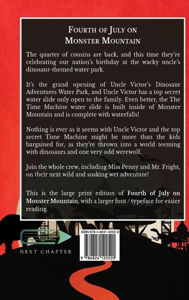 The quarter of cousins are back, and this time they're celebrating our nation's birthday at the wacky uncle's dinosaur-themed water park. It's the grand opening of Uncle Victor's Dinosaur Adventures Water Park, and Uncle Victor has a top secret water slide only open to the family. Even better, the The Time Machine water slide is built inside of Monster Mountain and is complete with waterfalls! Nothing is ever as it seems with Uncle Victor and the top secret Time Machine might be more than the kids bargained for, as they're thrown into a world teeming with dinosaurs and one very odd werewolf. Join the whole crew, including Miss Penny and Mr. Fright, on their next wild and soaking wet adventure! This is the large print edition of Fourth of July on Monster Mountain, with a larger font / typeface for easier reading.