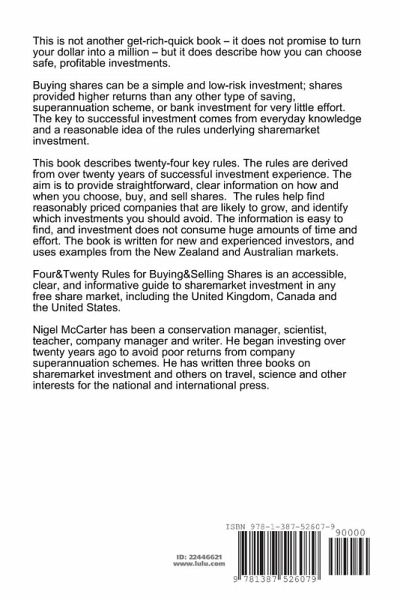 This book describes twenty-four key rules to buy safe, profitable shares. The rules are derived from over twenty years of successful investment experience. The book provides straightforward, clear information on how to choose, buy, and sell shares. The rules help find reasonably priced shares in companies that are likely to grow, and identify companies and other investments you should avoid. Data and examples have been updated to March 2019. The book is written for new and experienced investors, uses examples from the New Zealand and Australian markets, but the rules are applicable to any free sharemarket in United States, United Kingdom and Canada.