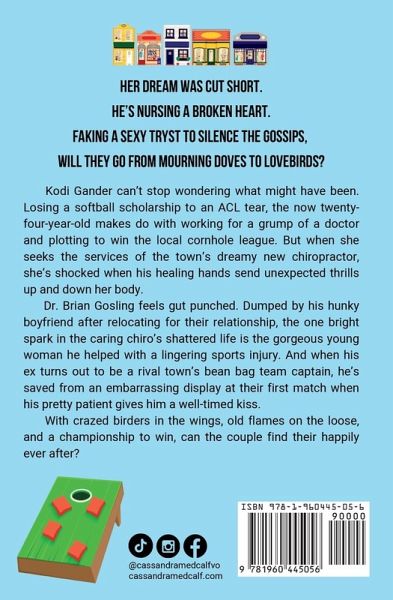 Her dream was cut short. He's nursing a broken heart. Faking a sexy tryst to silence the gossips, will they go from mourning doves to lovebirds? Kodi Gander can't stop wondering what might have been. Losing a softball scholarship to an ACL tear, the now twenty-four-year-old makes do with working for a grump of a doctor and plotting to win the local cornhole league. But when she seeks the services of the town's dreamy new chiropractor, she's shocked when his healing hands send unexpected thrills up and down her body. Dr. Brian Gosling feels gut punched. Dumped by his hunky boyfriend after relocating for their relationship, the one bright spark in the caring chiro's shattered life is the gorgeous young woman he helped with a lingering sports injury. And when his ex turns out to be a rival town's bean bag team captain, he's saved from an embarrassing display at their first match when his pretty patient gives him a well-timed kiss. Pretending to act as her nasty boss's spy, Kodi walks a fine line as the fake dates with her bisexual friend begin to turn into the real deal. And Brian struggles to move on as the feisty cornholer queen begins to give his wounds just the emotional adjustment he needed. With crazed birders in the wings, old flames on the loose, and a championship to win, can the couple find their happily ever after?
