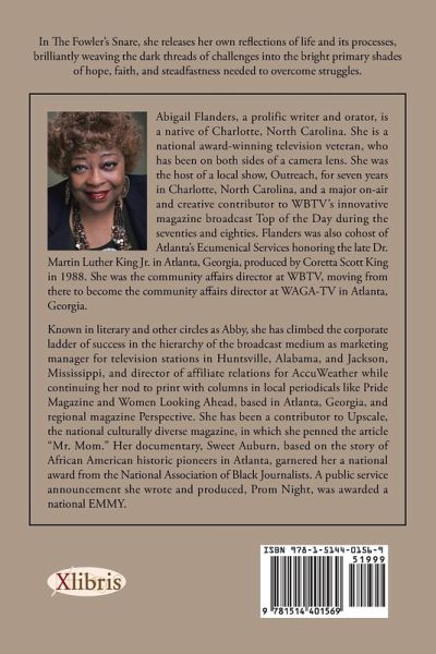 Abigail Flanders, a prolific writer and orator, is a native of Charlotte, North Carolina. She is a nationally award-winning television veteran, who has been on both sides of a camera lens. She was the host of a local show, "Outreach" for seven years in Charlotte, North Carolina and a major on-air and creative contributor to WBTV's innovative magazine broadcast, "Top of the Day" during the seventies and eighties. Flanders was also co-host of Atlanta's Ecumenical Services honoring the late Dr. Martin Luther King, Jr. in Atlanta, Georgia, produced by Coretta Scott King in 1988. She was the Community Affairs Director at WBTV, moving from there to become the Community Affairs Director at WAGA-TV in Atlanta, Georgia. Known in literary and other circles as "Abby," she has climbed the corporate ladder of success in the hierarchy of the broadcast medium, as Marketing Manager for television stations in Huntsville, Alabama and Jackson, Mississippi, and Director of Affiliate Relations for AccuWeather, while continuing her nod to print with columns in local periodicals like "Pride Magazine," and "Women Looking Ahead" based in Atlanta, Georgia; regional magazine, "Perspective" and has been a contributor to "Upscale," the national culturally diverse magazine, in which she penned the article, "Mr. Mom." Her documentary, "Sweet Auburn," based on the story of African-American historic pioneers in Atlanta, garnered her a national award from the National Association of Black Journalists. A public service announcement she wrote and produced, "Prom Night," was awarded a national EMMY. She is an author of "Fowler's Snare: Assassination and Resurrection of the Human Spirit," a book in which she releases her own reflections of life and its processes, brilliantly weaving the dark threads of challenges into the bright primary shades of hope, faith and steadfastness needed to overcome struggles.