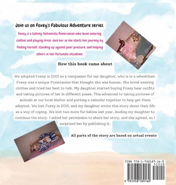 Special Addition: Personally Signed by Foxey. Foxey is a talking fashionista Pomeranian who loves wearing clothes and playing dress up. Join her as she starts her journey by finding herself, standing up against peer pressure, and helping others in less fortunate situations. Foxey Begins her story as a dog nobody wants because she is different. Foxey was to be sent to the pound before being rescued by a girl in a wheelchair, which showed Foxey the importance of embracing who you are. Together they work to fight back against peer pressure as they show people that being different can actually be a good thing. They work together to help bring attention to animals in the shelters to help them get adopted Special Bonus Foxey loved playing hide and seek. Every picture has one or more heart's hidden within the page. How many can you find? All parts of this Book are based on actual events.