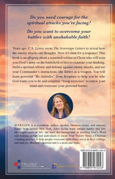 Do you need courage for the spiritual attacks you're facing? Do you want to overcome your battles with unshakable faith? Years ago, C.S. Lewis wrote The Screwtape Letters to reveal how the enemy attacks our thoughts. Now it's time for a response! This book is an allegory about a seasoned soldier in Christ who will train you (God's army on the battlefield of life) to examine your thinking, build a spiritual offense and defense against enemy attacks, and use your Commander's instructions (the Bible) as a weapon. You will learn powerful "Be Attitudes" from Scripture to help you be who God wants you to be and complete "troop exercises" to renew your mind and overcome your personal battles.