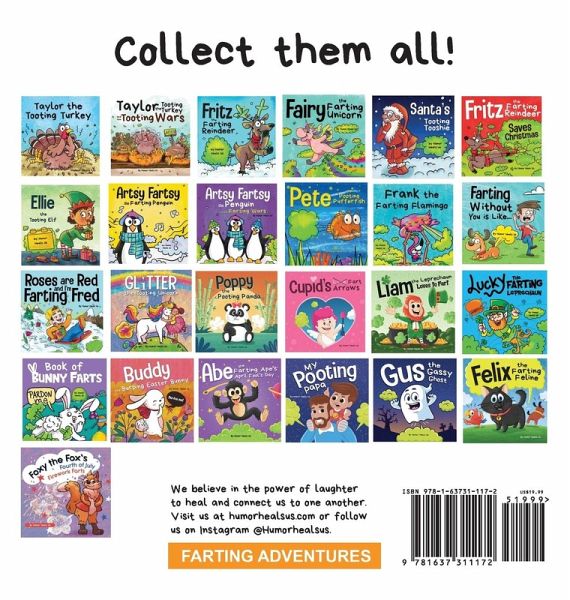 Foxy the Farting Fox shares a wide variety of his Fourth of July Firework Farts! Adults are permitted to laugh too. The book series, Farting Adventures, celebrates the value of laughter. The Farting Adventures book series is geared to kids and adults ages 0-100. Check out all the Farting adventures books: Taylor the Tooting Turkey Frank the Farting Flamingo Artsy Fartsy the Farting Penguin Fairy the Farting Unicorn Farting Without You is Like Roses are Red, And I'm Farting Fred Lucky the Farting Leprechaun Pete the Pooting Pufferfish and Fritz the Farting Reindeer Makes a perfect gift for Fourth of July for boys and girls or that someone special in your life.
