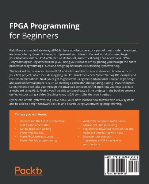 Get started with FPGA programming using SystemVerilog, and develop real-world skills by building projects, including a calculator and a keyboard Key Features:Explore different FPGA usage methods and the FPGA tool flow Learn how to design, test, and implement hardware circuits using SystemVerilog Build real-world FPGA projects such as a calculator and a keyboard using FPGA resources Book Description: Field Programmable Gate Arrays (FPGAs) have now become a core part of most modern electronic and computer systems. However, to implement your ideas in the real world, you need to get your head around the FPGA architecture, its toolset, and critical design considerations. FPGA Programming for Beginners will help you bring your ideas to life by guiding you through the entire process of programming FPGAs and designing hardware circuits using SystemVerilog. The book will introduce you to the FPGA and Xilinx architectures and show you how to work on your first project, which includes toggling an LED. You'll then cover SystemVerilog RTL designs and their implementations. Next, you'll get to grips with using the combinational Boolean logic design and work on several projects, such as creating a calculator and updating it using FPGA resources. Later, the book will take you through the advanced concepts of AXI and serial interfaces and show you how to create a keyboard using PS/2. Finally, you'll be able to consolidate all the projects in the book to create a unified output using a Video Graphics Array (VGA) controller that you'll design. By the end of this SystemVerilog FPGA book, you'll have learned how to work with FPGA systems and be able to design hardware circuits and boards using SystemVerilog programming. What You Will Learn:Understand the FPGA architecture and its implementation Get to grips with writing SystemVerilog RTL Make FPGA projects using SystemVerilog programming Work with computer math basics, parallelism, and pipelining Explore the advanced topics of AXI and serial interfaces Discover how you can implement a VGA interface in your projects Who this book is for: ¿This FPGA design book is for embedded system developers, engineers, and programmers who want to learn FPGA and SystemVerilog programming from scratch. FPGA designers looking to gain hands-on experience in working on real-world projects will also find this book useful.