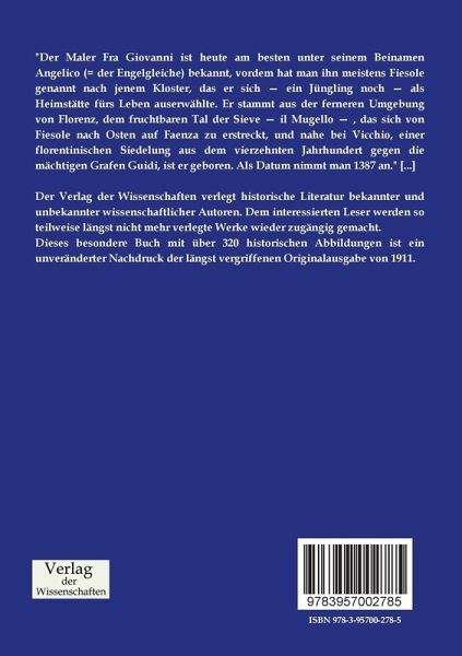 "Der Maler Fra Giovanni ist heute am besten unter seinem Beinamen Angelico (= der Engelgleiche) bekannt, vordem hat man ihn meistens Fiesole genannt nach jenem Kloster, das er sich ein Jüngling noch als Heimstätte fürs Leben auserwählte. Er stammt aus der ferneren Umgebung von Florenz, dem fruchtbaren Tal der Sieve il Mugello , das sich von Fiesole nach Osten auf Faenza zu erstreckt, und nahe bei Vicchio, einer florentinischen Siedelung aus dem vierzehnten Jahrhundert gegen die mächtigen Grafen Guidi, ist er geboren. Als Datum nimmt man 1387 an." [...]