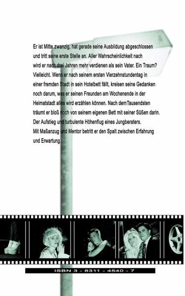 Er ist Mitte Zwanzig, hat gerade seine Ausbildung abgeschlossen und tritt seine erste Stelle an. Aller Wahrscheinlichkeit nach wird er nach drei Jahren mehr verdienen als sein Vater. Ein Traum? Vielleicht. Wenn er nach seinem ersten Vierzehnstundentag in einer fremden Stadt in sein Hotelbett fällt, kreisen seine Gedanken noch darum, was er seinen Freunden am Wochenende in der Heimatstadt alles wird erzählen können. Nach dem Tausendsten träumt er bloß noch von seinem eigenen Bett mit seiner Süßen darin. Der Aufstieg und turbulente Höhenflug eines Jungberaters. Mit Maßanzug und Mentor betritt er den Spalt zwischen Erfahrung und Erwartung.