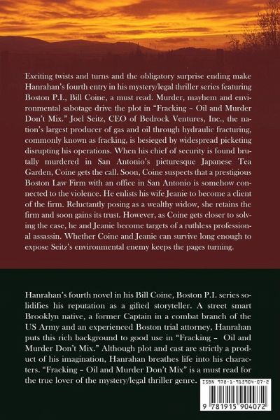 FRACKING - OIL AND MURDER DON'T MIX Hanrahan's fourth novel featuring Boston private eye Bill Coine, continues his hard hitting mystery writing talent with believable law enforcement and courtroom underpinnings. Plot turns and surprises await.