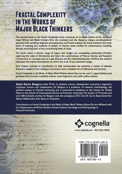 The second book in the Fractal Complexity series continues its in-depth review of the works of major African and Black thinkers from the continent and the diaspora. Using a pluridisciplinary approach that combines linguistic presupposition and fractal analysis, the book examines the many levels of meaning and similarity of pattern in literary texts studied for mathematical modeling, thereby enriching both of the contributing fields of study. The book covers a diverse range of topics with insight and outstanding scholarship. Whether exploring the roles of Christianity and Islam, the contributions of Marcus Garvey and Toussaint L'Ouverture, or concepts such as a pax Africana and the underdevelopment of Africa, the material addresses the implicit assumptions on which the truth of any statement hangs. Each chapter includes an introduction to help contextualize the selection, a review of relevant literature, analysis of the reading, a conclusion, and a complete list of references and sources. Fractal Complexity in the Works of Major Black Thinkers, Volume Two can be used in upper-division and graduate level courses in political science, socio-linguistics, and public policy analysis. Abdul Karim Bangura holds Ph.D.s in political science, development economics, linguistics, computer science, and mathematics. Dr. Bangura is a professor of research methodology and political science at Howard University, and a researcher-in-residence at the Center for Global Peace in the School of International Service at American University. The author of 70 books and over 600 scholarly articles, Dr. Bangura won the prestigious 2012 Cecil B. Curry Book Award for African Mathematics: From Bones to Computers.