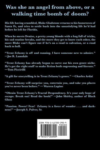 Was she an angel from above, or a walking time bomb of doom? His life having crumbled, Blake Gladstone returns to his hometown of Santa Fe, and tries to settle back into the unsatisfying life he'd had before he left for Florida. When he meets Denise, a pretty young blonde with a bag full of tricks, his sad routine breaks, and the more they get to know each other, the more Blake can't figure out if he's on a road to salvation, or a road back to hell. "Trent Zelazny is off and running. I have someone new to admire." -Joe R. Lansdale "Trent Zelazny has already begun to carve out his own genre niche. He's got the right stuff to make fiction both engrossing and literate." -Tom Piccirilli "A gift for storytelling is in Trent Zelazny's genes." -Charles Ardai "Trent Zelazny will surprise you, entertain you, and take you places you've never been before." - Warren Lapine "Obtain Trent Zelazny's Fractal Despondency. It's your only hope of escape. Break out! Read the book!" -John Shirley, author of Black Glass "Passion. Power! Fear! Zelazny is a force of wonder . . . and darkness!" -Joseph S. Pulver, Sr.