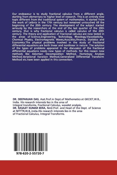 Our endeavour is to study fractional calculus from a different angle, starting from elementary to higher level of research. This is an entirely new topic different from the traditional system of mathematics. It started from the work of Leibniz in the 17th century but remained untouched till the beginning of the 20th century. The development of the subject started seriously by the researchers at the end of the last quarter of the 20th century, that is why fractional calculus is called calculus of the 20th century. The theory and application of fractional calculus are now tested in the areas of Science,Engineering, Technology, Rheology,Viscoelasticity, Chemical Physics, Electromagnetic Waves,Acoustics,Finance, Statistics and Economics.The physical problems involved in the study of fractional differential equations are both linear and nonlinear in nature. The solution of the types of problems appeared in the discussion of the fractional differential equations needs new types of methods. For this reason new methods like Adomian Decomposition Method, Homotopy Analysis Method,Variational Itaration Method,Generalized Differential Transform Method etc.have been applied in this connection.
