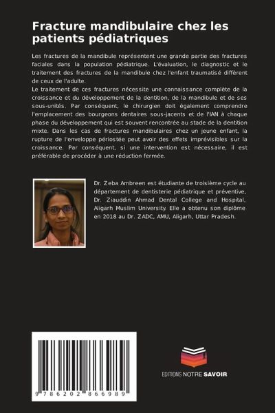 Les fractures de la mandibule représentent une grande partie des fractures faciales dans la population pédiatrique. L'évaluation, le diagnostic et le traitement des fractures de la mandibule chez l'enfant traumatisé diffèrent de ceux de l'adulte.Le traitement de ces fractures nécessite une connaissance complète de la croissance et du développement de la dentition, de la mandibule et de ses sous-unités. Par conséquent, le chirurgien doit également comprendre l'emplacement des bourgeons dentaires sous-jacents et de l'IAN à chaque phase du développement qui est souvent rencontrée au stade de la dentition mixte. Dans les cas de fractures mandibulaires chez un jeune enfant, la rupture de l'enveloppe périostée peut avoir des effets imprévisibles sur la croissance. Par conséquent, si une intervention est nécessaire, il est préférable de procéder à une réduction fermée.